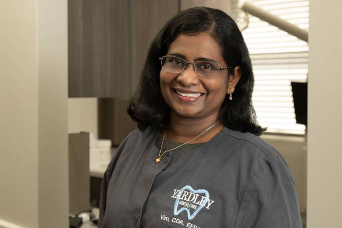 Vimala works with us at Yardley PA Dental Care and is a Certified Dental Assistant. Vimala is a graduate of Madras Dental College, India. Vimala has 20 years of experience in general dentistry. As is all our staff in the Yardley Pennsylvania Dentist office, her primary goal is to make patients feel comfortable and at ease when in her care. Vimala assists Dr. Kenwood, the hygienists, and the front desk. As part of the Yardley Dental Care team, she loves working with the rest of the talented group. Outside the office, Vimala enjoys spending time with her husband and two children.